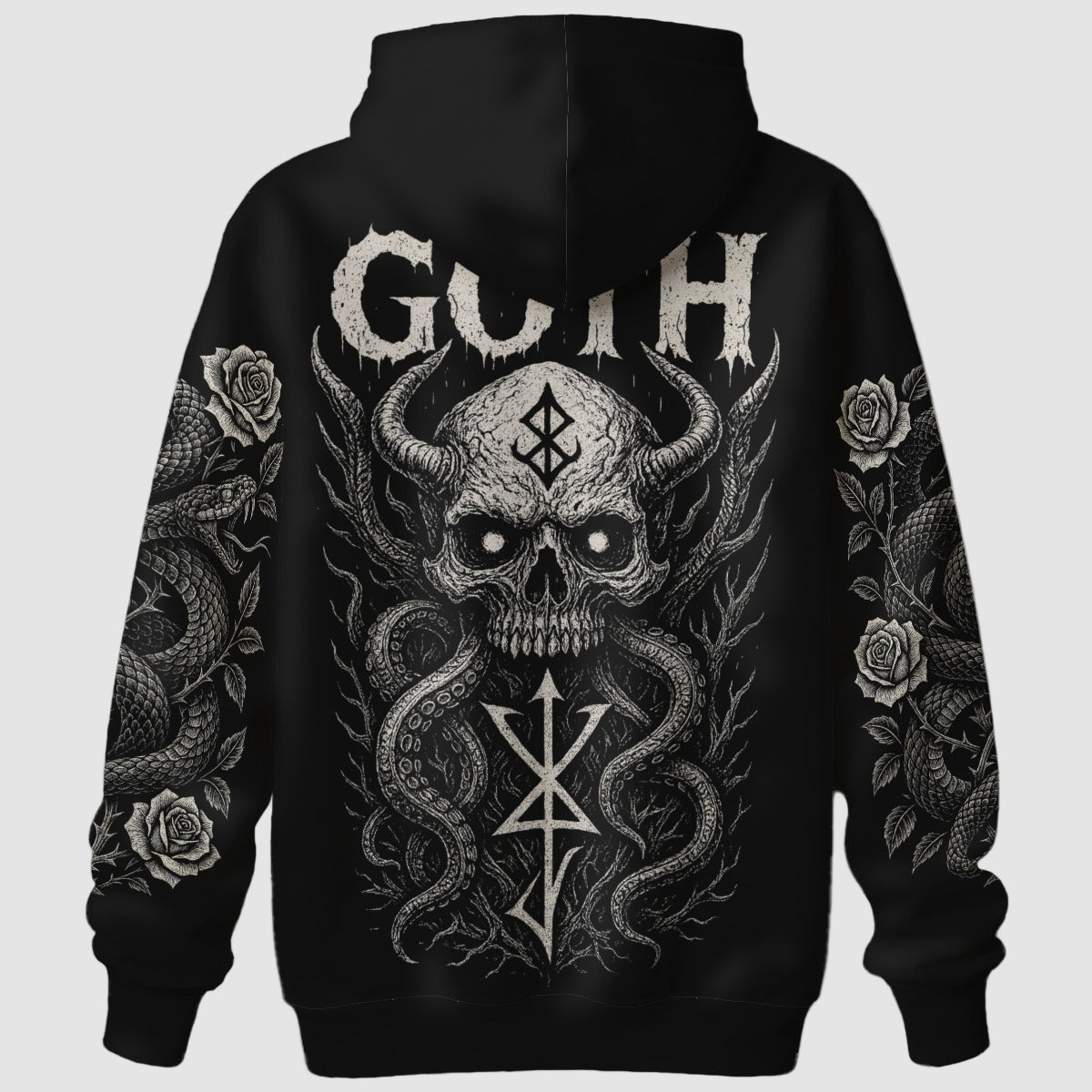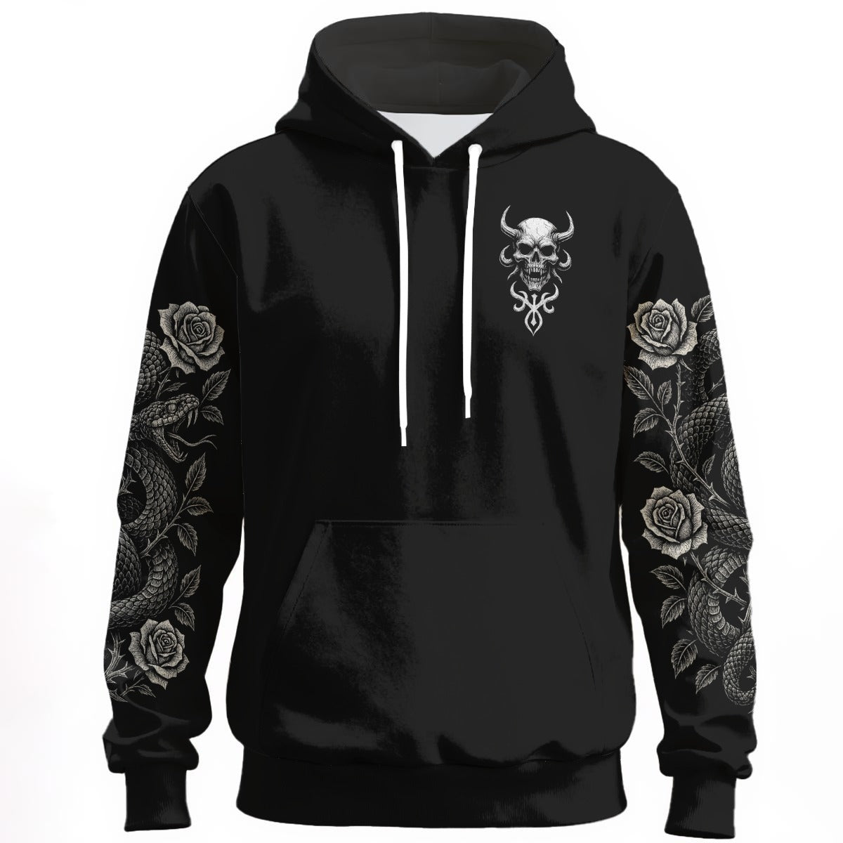 Exprimă-ți individualitatea cu hanoracul unic „The Serpent’s Oath” - creat pentru iubitorii esteticii gotice și modei alternative. Designul întunecat cu motiv de craniu, șerpi și trandafiri simbolizează forța, misterul și liniștea interioară. Nu este doar o haină – este un manifest de stil.