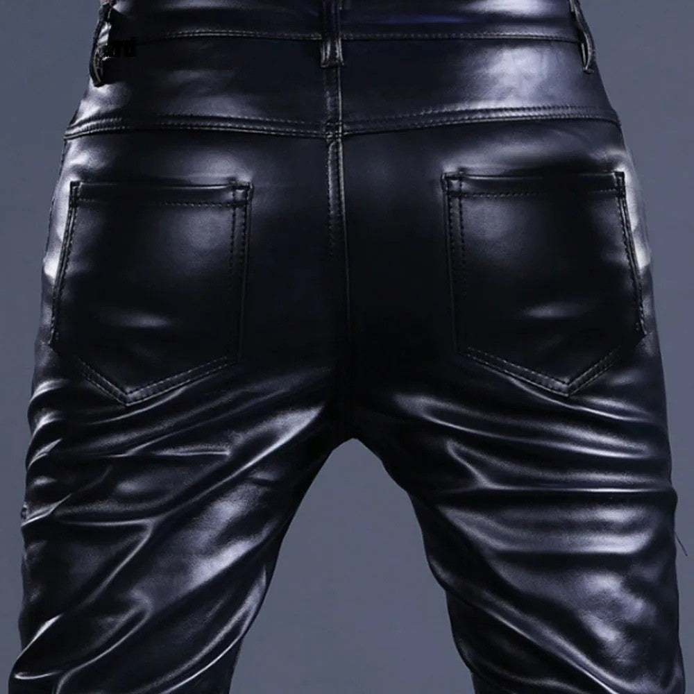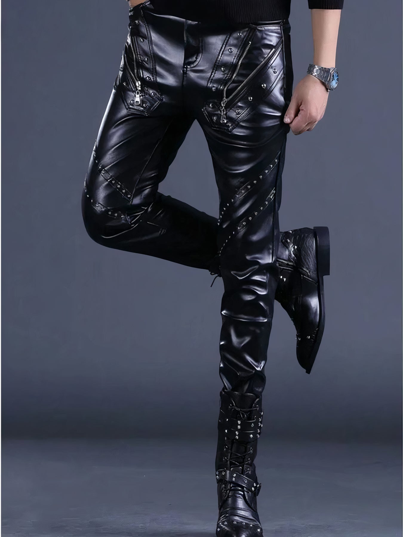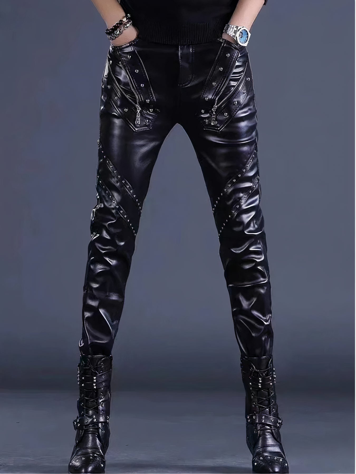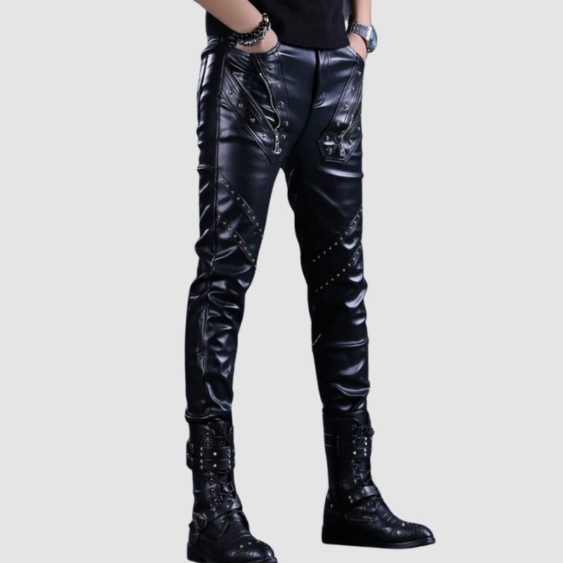 Pantaloni cu ținte și fermoare în stil rock din piele ecologică